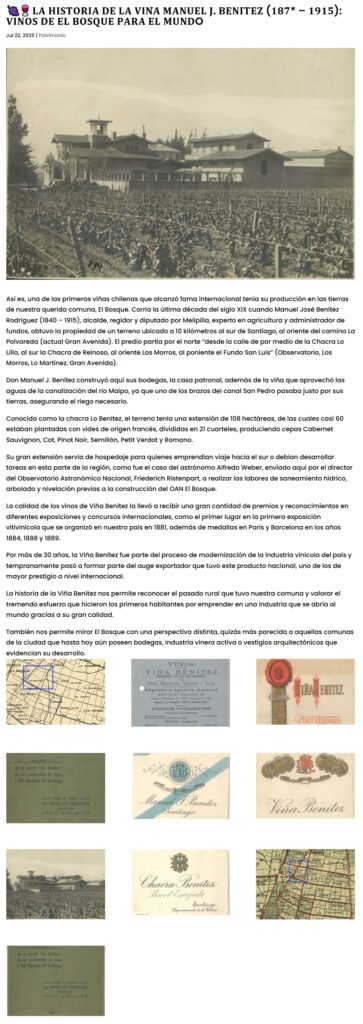 Ubicada en la llamada Chacra Benítez, el antiguo departamento de La Victoria, en la zona sur de Santiago, Viña Benítez elaboró vinos finos desde fines de 1800, produciendo principalmente cepas de origen francés como Cabernet Sauvignon, Cot, Pinot Noir, Semillón, Petit Verdot, Romano, entre otras. Precisamente en una época donde el vino chileno comenzó a hacerse conocido en el mundo, gracias a la incorporación de un proceso productivo más tecnificado y que culminó con el florecimiento de esta actividad económica. En esos años, el vino chileno adquirió otro rostro y la producción creció, junto con la mejoría notable de los sistemas de transporte y comercialización.